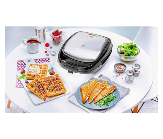 Tefal Snack Time 2 v 1, multifunkční přístroj s kovovou vložkou pro přípravu trojúhelníkových toustů a vaflí, představuje jedinečné řešení, které spojuje sendvičovač a vaflovač pro vždy dokonale sladké i slané chuťovky. Navíc jeho kovový vzhled dodá výrobku prémiový design.