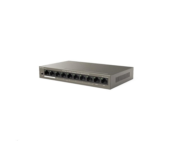 Tenda TEF1110P-8-63W přepíná data pomocí 10ti portů RJ45, 8 portů 10/100 Mb/s podporuje PoE802.3af/at + 2 porty 10/100 Mb/s pro Uplink. Switch má ochranu proti přepětí 6kV. Podpora přepojování uzlů v módu Store-and-Forward. Full-duplex kontrola toku 802.3x, half-duplex kontrola toku v režimu Back-Pressure. Dva Uplink porty je možné využít na připojení switche do sítě a druhý na připojení dalšího zařízení bez PoE, např. NVR a další.
