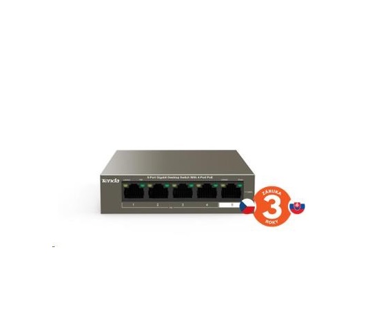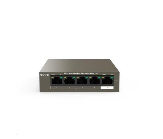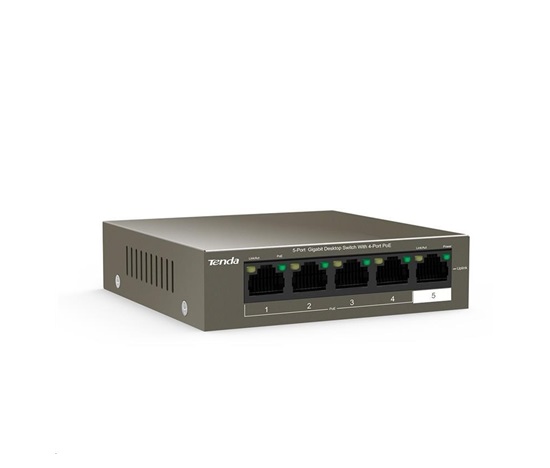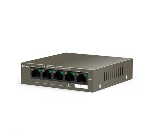 Tenda TEG1005P-4-63W přepíná data pomocí 5ti portů RJ45 s přenosovou rychlostí 10/100/1000 Mb/s s automatickou detekcí rychlosti. Jeden port slouží pro Uplink a 4 PoE porty podporují PoE 802.3af a 802.3at. Switch podporuje stabilní 8 jádrové PoE napájení, ochrana proti přepětí 6kV. Podpora přepojování uzlů v módu Store-and-Forward. Full-duplex kontrola toku 802.3x, half-duplex kontrola toku v režimu Back-Pressure.