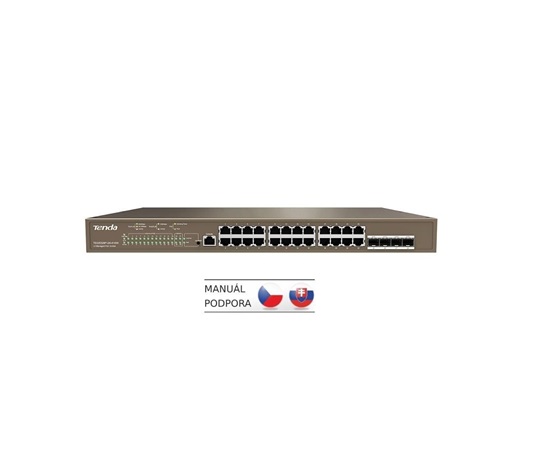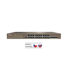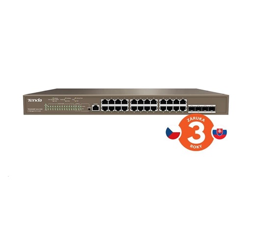 Tenda TEG5328P-24-410W je 24 portový Gigabitový PoE switch s PoE af/at. 24x 10/100/1000 Mb/s PoE 802.3af/at (celkem 370 W) + 4x SFP 1000Mb/s + 1x Console. Layer L3 routing, STP/RSTP/MSTP, IGMP Snooping V1/V2/V3, VLAN, Static+aging ARP, SNMP, ochrana přepětí 6kV, Rackmount