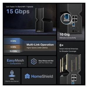 | Advanced Features | • Multi-Link Operation (MLO) • 320 MHz Channel • 4K-QAM • Multi-RUs • EasyMesh-Compatible • Works with Alexa and Google Assistant • IoT Network |