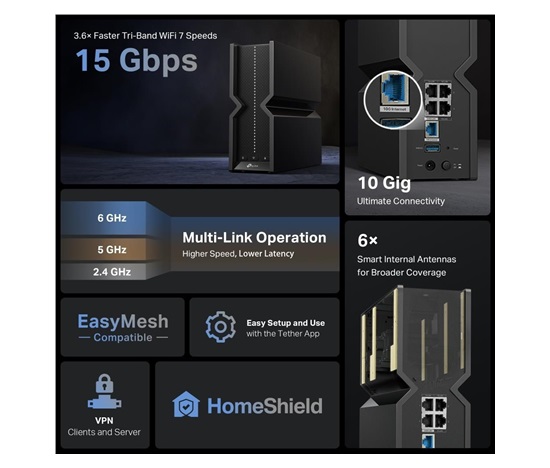 - Třípásmová Wi-Fi s bleskovou rychlostí 15 Gb/s: Wi-Fi 7 naplno využívá potenciál pásma 6 GHz s kanály až 320 MHz a rychlostí Wi-Fi 11,5 Gb/s. Užijte si plný přístup ke streamování v rozlišení 8K a vysokorychlostnímu stahování.