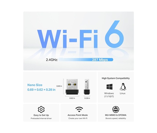 | Package Content | 1× AX300 Nano Wi-Fi 6 Wireless USB Adapter Archer TX1U Nano 1× Quick Installation Guide |