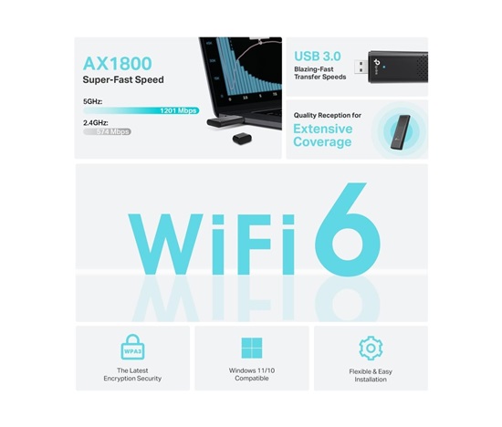 - Bleskově rychlá WiFi 6 – Streamujte videa s rychlostí bezdrátového přenosu 1800 Mb/s (1201 Mb/s na 5 GHz + 574 Mb/s na 2,4 GHz