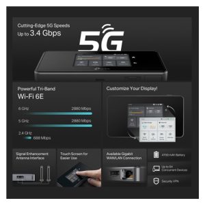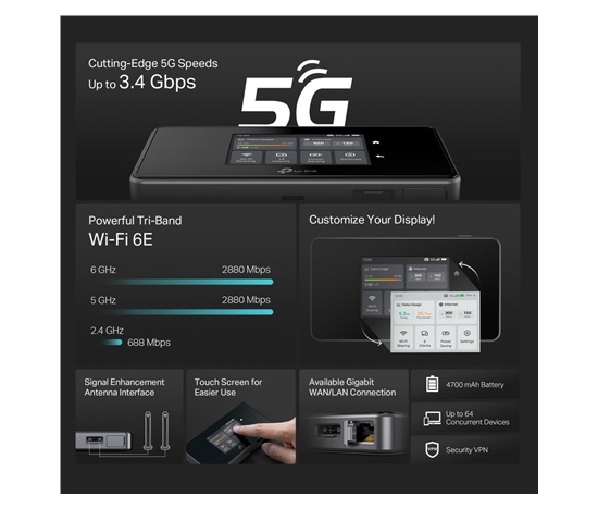 | Package Content | 5G AXE3600 Mobile Router M8550 Power Adapter USB-C Cable 4680 mAh Battery Quick Installation Guide |