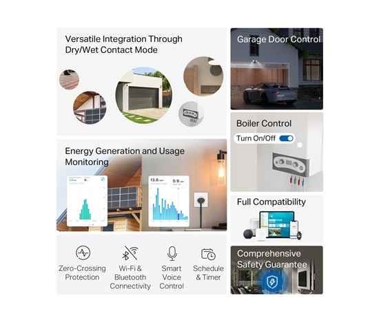 - Ovládání garážových vrat: Upgradujte svá garážová vrata pro chytré hlasové ovládání, dálkové ovládání a plynulou automatizaci, s možností nastavení jedinečného PIN kódu.