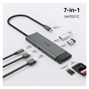 - 7v1 USB-C Hub: UH7021C promění jeden USB-C port na 7 portů: 4K@60Hz HDMI, SD a microSD UHS-I, napájení 100 W a 3× USB-A datové porty.