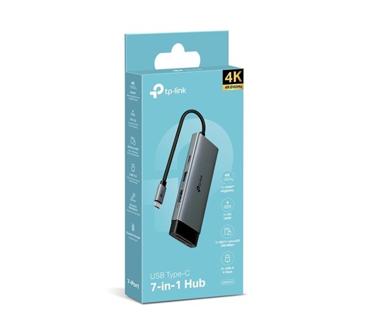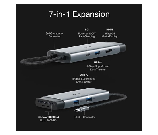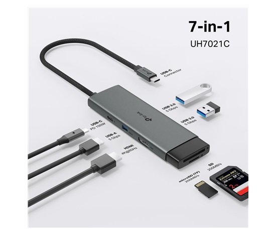 - 7v1 USB-C Hub: UH7021C promění jeden USB-C port na 7 portů: 4K@60Hz HDMI, SD a microSD UHS-I, napájení 100 W a 3× USB-A datové porty.