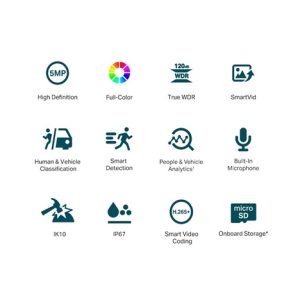 Smart Event Human & Vehicle Classification, Area Intrusion Detection, Line-Crossing Detection, People Detection, Vehicle Detection, Region Entering Detection, Region Exiting Detection, Object Abandoned Detection, Object Removal Detection, Loitering Detection