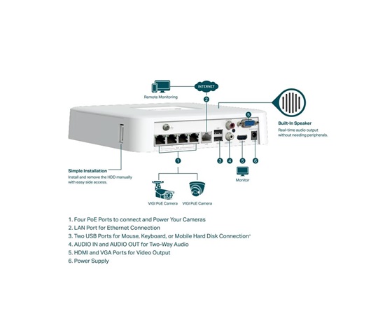 - Vzdálené monitorování – Vyhrazená aplikace VIGI, webové uživatelské rozhraní a VIGI Security Manager umožňují vzdálené monitorování.