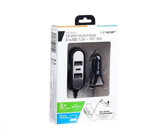The TRACER 12-24V MULTICHARGE 3xUSB 7.2A + PD 18W car charger was created for both the driver and the passengers. It has a total of 3 USB ports for charging mobile devices or navigation as well as a USB-C port with PD 18W function, which allows you to charge selected Macbooks and netbooks that support the newest technology. It is a small and classy-looking device useful on every journey. In total, it supports up to 7.2A.