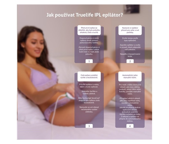 Užijte si viditelně hladší pokožku již po 4 týdnech používání epilátoru TrueLife BELLE IPL E3. Epilátor, který pracuje s technologií TrueIPL®, vás při pravidelném používání účinně zbaví nežádoucích chloupků. S epilátorem snadno ošetříte všechny partie těla, obličej a podpaží, oblast bikin i celé nohy. To vše díky technologii SensCool® zcela bezbolestně, šetrně a bezpečně. Epilátor vysílá záblesky, které pod povrchem pokožky zasahují melanin ve folikulu chloupku, a napomáhají tak přerušit cyklus dorůstání chloupků. Pravidelné používání TrueLife BELLE IPL E3 zanechá vaší pokožku sametově hebkou, bez nutnosti holení nebo nákladných a bolestivých kosmetických ošetření. Použití epilátoru je snadné a zvládne jej každý.