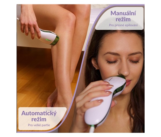 Epilátor TrueLife BELLE IPL E3 nabízí dva režimy. Manuální režim jednotlivých záblesků je vhodný k epilaci malých a těžko dostupných oblastí, jako jsou obličej, podpaží, oblast bikin nebo kotníky. S automatickým režimem rychle a pohodlně ošetříte větší oblasti, například nohy. Jakmile se přístroj dotkne epilované oblasti, jednoduše podržíte tlačítko ovládání po dobu 3 sekund, epilátor se přepne do automatického režimu, kdy při plynulém pohybu po pokožce bude neustále vydávat záblesky.