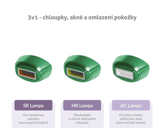 Epilátor TrueLife BELLE IPL E3 využijete kromě samotné epilace i k dalším aplikacím. Stačí pouze vyměnit lampu. K dlouhodobému a účinnému odstranění chloupků vám poslouží HR lampa, která je součástí balení. Nejednoho člověka trápí akné. Pokud chce mít obličej čistý a hebký na dotek, doporučujeme si pořídit AC lampu. Pokud chcete svoji pokožku omladit, pomůže vám s tím SR lampa.