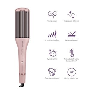 Trojkulma TrueLife HairWaver W6 si vás získá svým designem, ale jakmile uvidíte krásu svých vlasů po jejím použití, stane se vaší nejlepší kamarádkou. Trojitý design, kdy vlasy jednoduše vložíte mezi 3 topné části a stisknete dohromady, vyčaruje snadno, rychle a přitom šetrně přirozené vlny. Jejich délku si nastavíte dle preferencí díky vysouvací nahřívací ploše, na výběr máte ze 4 úrovní. Získáte tak velkou škálu účesových variací. Díky technologii TrueLife ConstantHeat teplota při stylingu vlasů nekolísá, drží se stále na zvolené teplotě a vlasům tak nehrozí poškození.
