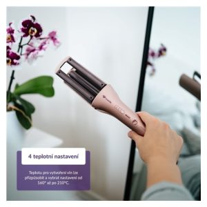 Teplotu pro tvorbu vln snadno přizpůsobíte svým vlasům, k dispozici jsou čtyři možné teploty – 160 °C, 180 °C, 200 °C nebo 210 °C.