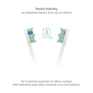 Opotřebené štětiny kartáčku se třepí, ztrácejí účinnost a hromadí se na nich bakterie. Hlavice sonického kartáčku jsou osazeny modrými štětinami, které po 3 měsících zbělají a upozorní vás tak na nutnost výměny.