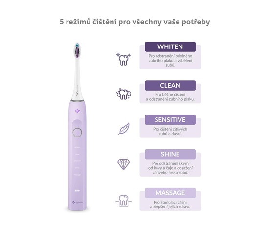 Kartáček nabízí 5 různých režimů čištění – Clean (pro běžné čištění), Shine (pro lesk a odstranění skvrn), Sensitive (pro citlivé zuby), Whiten (pro bělení a odstranění odolného plaku), Massage (pro stimulaci a lepší zdraví dásní).