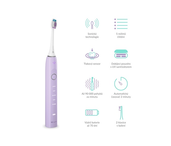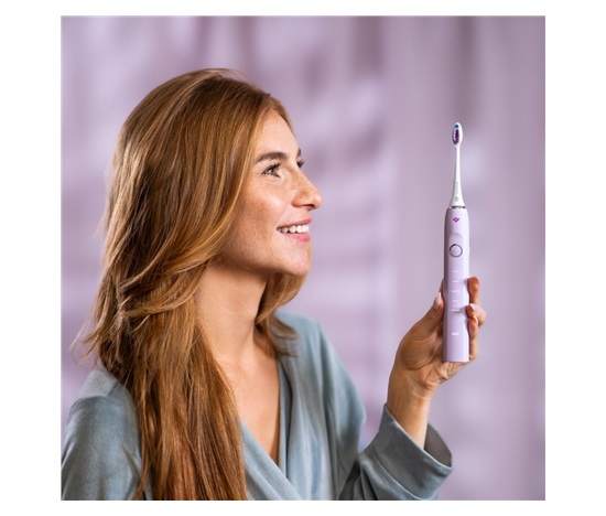 Chytré technologie pro tu nejlepší dentální péči se potkávají v TrueLife SonicBrush Clean70 UV, sonickém kartáčku v elegantní levandulové variantě, který odstraní s výkonem až 90 000 pohybů za minutu až 12× více zubního plaku než manuální kartáček. Sonická technologie SonicTrue pomocí jemných vibrací čistí plošky zubů a díky víření vody s pastou vytváří mikrobublinky, které proniknou i do mezizubních prostor. Tlakový senzor s technologií SmartPressure hlídá, abyste si přílišným tlakem na zuby a dásně nepřivodili zdravotní obtíže. Velkou službu vám prokáže také UV sterilizace ukrytá v dobíjecím pouzdře, která efektivně ničí až 99,9 % bakterií a virů z hlavice kartáčku. Hýčkat své zuby můžete doma i na cestách, a to až 70 dní na jedno nabití, pomocí 5 režimů čištění (Whiten, Clean, Sensitive, Shine, Massage) a 2 přiložených hlavic (Standard a Sensitive). Poslední použitý režim zůstává uchován v paměti a automaticky se spustí po opětovném zapnutí. Kartáček běží ideální 2 minuty, na něž je nastavený časovač. Díky vysoce citlivému vibračnímu senzoru se navíc automaticky aktivuje a rozsvítí, jakmile jej vezmete do ruky, stačí uchopit a můžete začít čistit. Speciální jemně pogumovaná povrchová úprava rukojeti je příjemná na dotek a zabraňuje klouzání i při použití s vodou.
