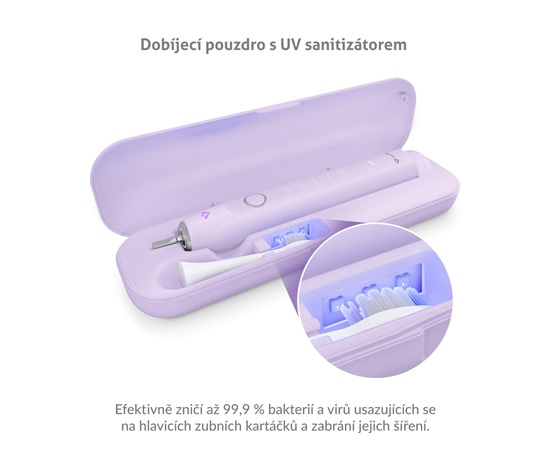 Na hlavicích kartáčů se usazují viry a bakterie, které mohou způsobit nepříjemnosti v ústní dutině. Stačí však 5 minut a UV sterilizace jich až 99,9 % zničí. Pouzdro vydrží na jedno nabití až 17 dní při použití 2× denně.