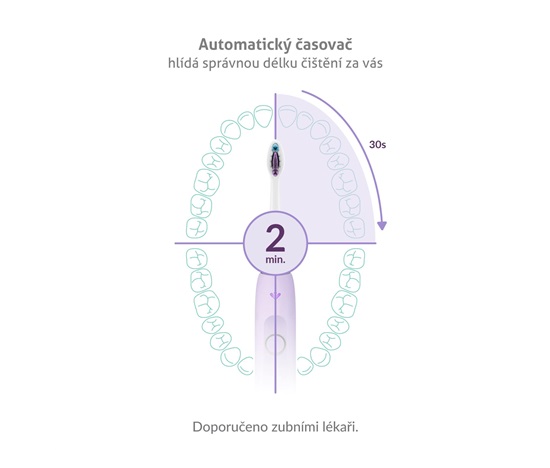 Zuby je ideální čistit po dobu 2 minut, což ohlídá automatický časovač. Navíc vždy po 30 vteřinách upozorní, že je potřeba přejít na čištění další části úst.