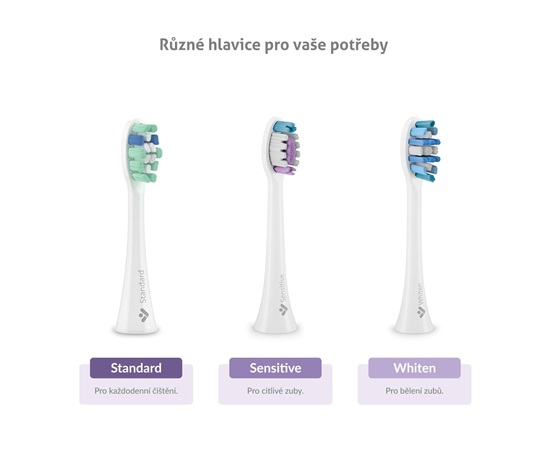 Balení sonického kartáčku zahrnuje 2 hlavice, které jsou určeny pro běžné každodenní čištění (Standard) a pro citlivé zuby (Sensitive). Dokoupit lze hlavici Whiten na bělení zubů.