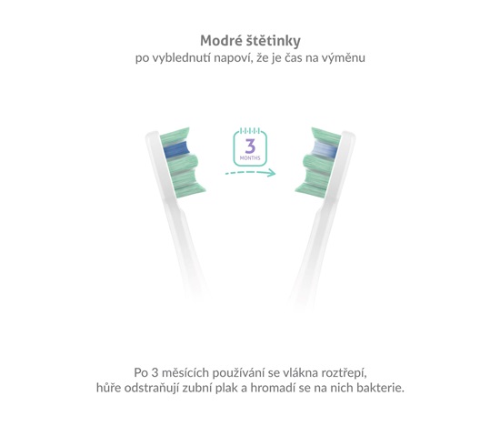 Opotřebené štětiny kartáčku se třepí, ztrácejí účinnost a hromadí se na nich bakterie. Hlavice sonického kartáčku jsou osazeny modrými štětinami, které po 3 měsících zbělají a upozorní vás tak na nutnost výměny.