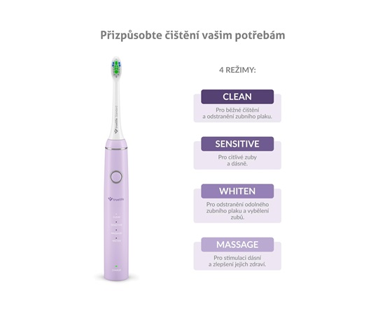 Pro maximální účinnost jsme kartáčky vybavili hned čtyřmi režimy. Dohromady se skvěle postarají o vaše ústa – ať chcete mít bělejší úsměv, správně prokrvit dásně nebo si jen efektivně vyčistit zuby.