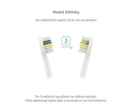 Hlavice disponují modrými štětinkami, které indikují míru opotřebení. Snadno poznáte, že je načase hlavici vyměnit.