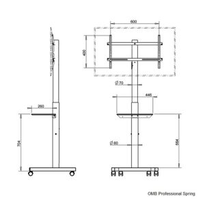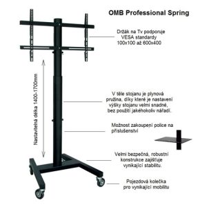 Profesionální stojan robustní, velmi pevné, bezpečné a stabilní konstrukce, který má uvnitř nosníku integrovanou plynovou pružinu pro možnost velmi snadného nastavení výšky obrazovky bez nutnosti použití jakéhokoliv nářadí, navíc neskutečně rychle a pohodlně. Plynová pružina zajistí po stlačení bezpečnostní páčky plynulé vyjetí obrazovky do horní pozice, v případě potřeby snížit výšku stačí zatlačit na obrazovku. Regulovat výšku je možné v rozmezí 140cm až 170cm (výška stojanu po střed obrazovky). Stojan je ideální na televizory a monitory s hmotností do 40kg, které podporují jakýkoliv VESA standard v rozmezí 100×100 až 600x400mm včetně. Doporučená úhlopříčka je 32″ až 65″, ale je možné použít i větší obrazovky až do úhlopříčky 65″. Podstavec stojanu je osazen kvalitními pojezdovými kolečky, které zajišťují vynikající mobilitu. Televizní stojan OMB Professional Spring dodáváme v černém provedení.
