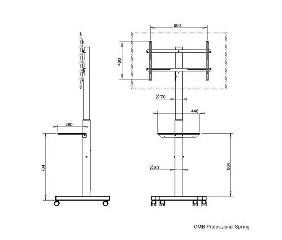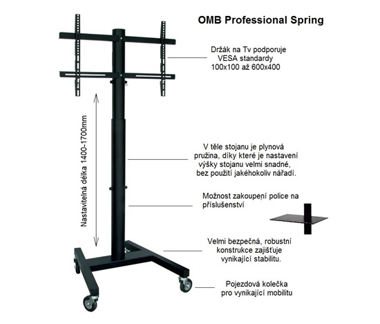 Profesionální stojan robustní, velmi pevné, bezpečné a stabilní konstrukce, který má uvnitř nosníku integrovanou plynovou pružinu pro možnost velmi snadného nastavení výšky obrazovky bez nutnosti použití jakéhokoliv nářadí, navíc neskutečně rychle a pohodlně. Plynová pružina zajistí po stlačení bezpečnostní páčky plynulé vyjetí obrazovky do horní pozice, v případě potřeby snížit výšku stačí zatlačit na obrazovku. Regulovat výšku je možné v rozmezí 140cm až 170cm (výška stojanu po střed obrazovky). Stojan je ideální na televizory a monitory s hmotností do 40kg, které podporují jakýkoliv VESA standard v rozmezí 100×100 až 600x400mm včetně. Doporučená úhlopříčka je 32″ až 65″, ale je možné použít i větší obrazovky až do úhlopříčky 65″. Podstavec stojanu je osazen kvalitními pojezdovými kolečky, které zajišťují vynikající mobilitu. Televizní stojan OMB Professional Spring dodáváme v černém provedení.