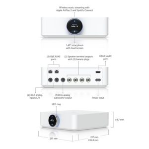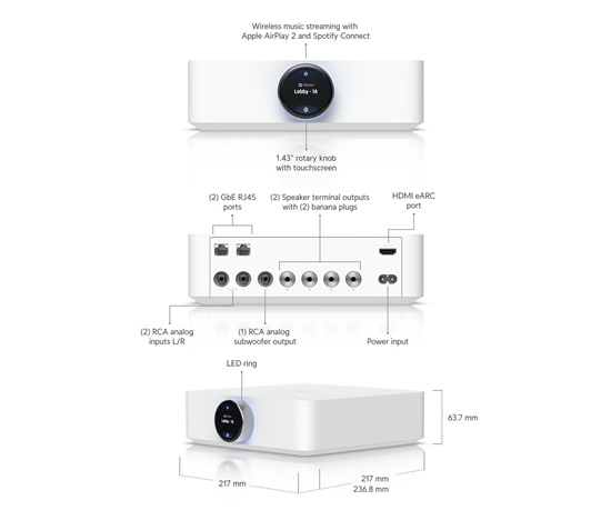 Prémiový zesilovač navržený pro vysoce věrné vícezónové streamování zvuku a pohlcující prostorový zvuk. Nabízí výkon 130 W na kanál při 8 ohmech a poskytuje výkonný, pohlcující zvuk s podporou Dolby Atmos a Dolby TrueHD, což zaručuje prvotřídní zážitek z poslechu. UniFi PowerAmp se bezproblémově integruje s A/V UniFi pro pro jednotné nastavení sítě a zvuku, které lze snadno spravovat prostřednictvím mobilní aplikace UniFi Play. UniFi PowerAmp můžete umístit na jakýkoli rovný povrch, takže je ideální pro domácí i profesionální prostředí. Jeho kompaktní design také umožňuje instalaci do racku, kdy se dva PowerAmpy vejdou vedle sebe do 2U racku. Zařízení funguje samostatně bez nutnosti použití konzole UniFi a nabízí možnost plug-and-play instalace pro uživatele, kteří chtějí okamžitý přístup k vysoce kvalitnímu zvuku prostřednictvím analogových vstupů nebo síťového streamování přes Apple AirPlay 2 a Spotify Connect.