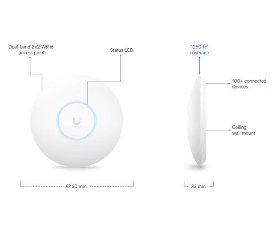 UniFi 6+ Access Point je základní Dual Band WiFi 6 AP (2.4GHz a 5GHz) do menších hal, skladů či kanceláří. U6+ je schopen dosáhnout skvělých propustností. V pásmu 5 GHz (2×2 MIMO) je to 2402 Mbps při použití 160 MHz šířkou pásma a ve 2.4 GHz (2×2 MIMO) je to 574 Mbps, což mu umožňuje podporovat více než 300 současně připojených klientů. Pro připojení do sítě má Access Point Gigabitový ethernet s podporou aktivního (802.3at) ale i pasivního (44 až 57V) PoE.
