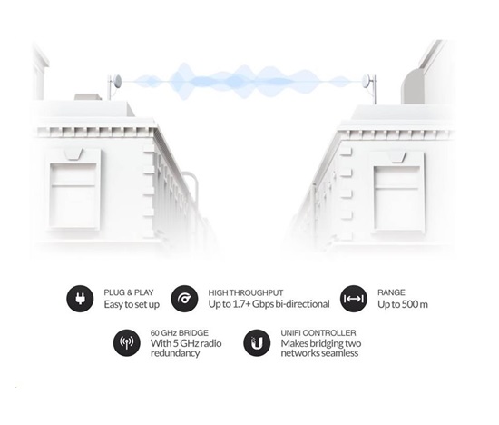 UniFi Building Bridge je 60GHz point-to-point pojítko s 5GHz zálohou pro rozšíření sítě například o sousední budovu. Propustnost pojítka je 1.7Gbps+ s maximálním dosahem 500m a správou nebo monitoringem přes UniFi Controller.