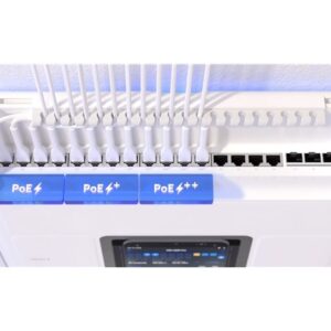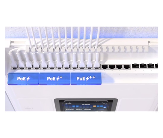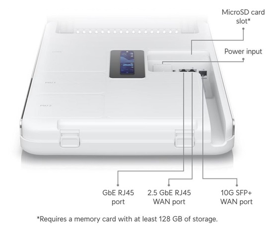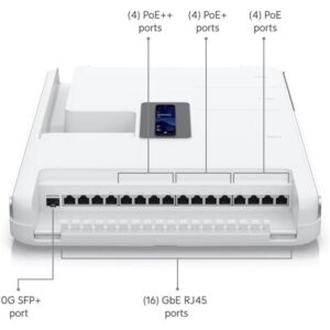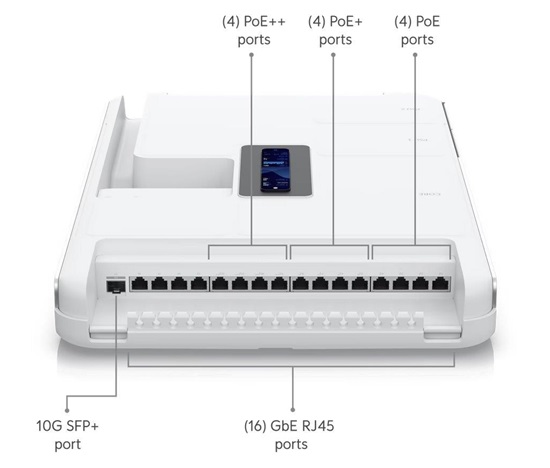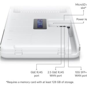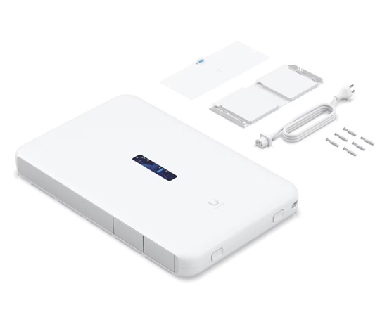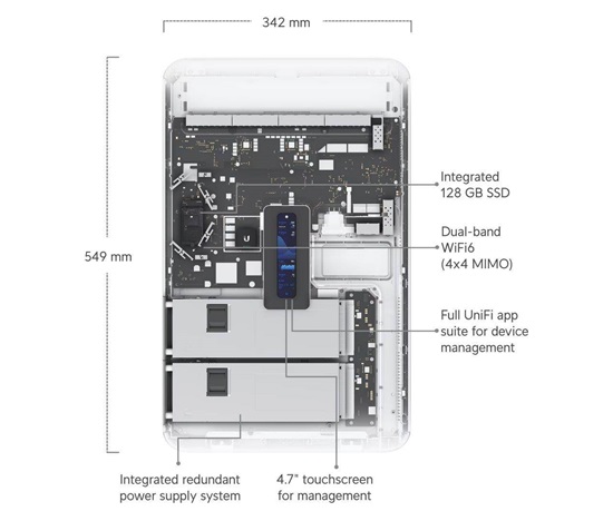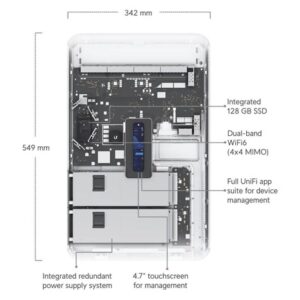 Dream Wall je další z řady zařízení UniFi All-in-one. Ukrývá v sobě bránu s firewallem, Wi-Fi 6 access point, NVR a switch s funkcí PoE. Jednotka poskytuje široké možnosti připojení do sítě. Nabízí možnost připojení 10Gbps SFP+ portem nebo ethernetovým portem 2.5Gbps. Pro připojení dalších zařízení v síti LAN pak nabízí 10Gbps SFP+ port spolu se 17 ethernetovými 1Gbps porty, z nichž 12 disponuje funkcí PoE (4x POE++, 4x POE+ a 4x POE). Z výroby je zařízení osazeno jedním hot-swap zdrojem s výkonem 550W a k dispozici je druhá pozice pro redundanci. Maximální spotřeba zařízení činí 532W včetně připojených napájených zařízení.