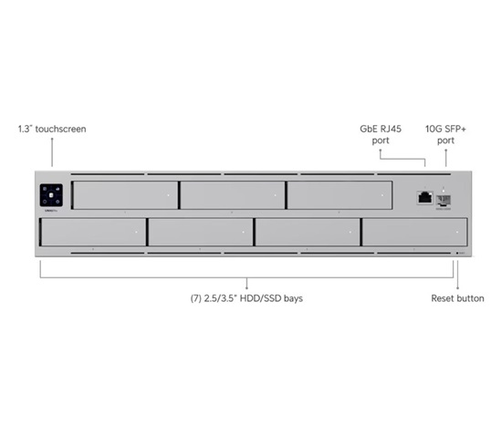 NAS pro montáž do 2U racku disponující 7x 2,5/3,5″ pozicemi pro disk, jedním Gbe RJ-45 portem a jedním 10G SFP+ portem pro uplink. Vhodný pro ukládání velkých souborů. Poháněn je čtřjádrovým procesorem ARM Crotex-A57 pracující na frekvenci 1,7 GHz, který je doplněný o 8 GB operační paměti.