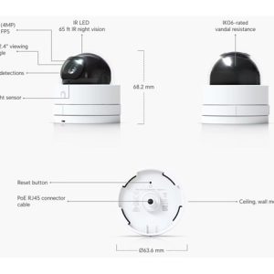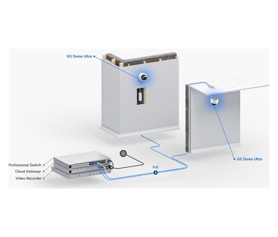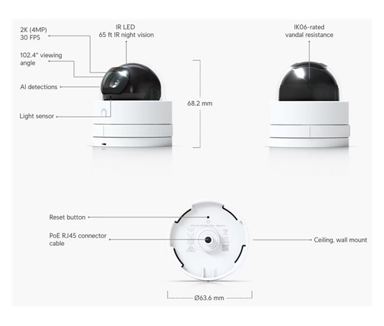 UVC-G5-Dome-Ultra je kamera 5. generace z řady UniFi Video. Disponuje snímačem 1/2.4″ CMOS s rozlišením 4MP (2688 x 1512 px, 16:9) @ 30 FPS. Fixní objektiv má pozorovací úhel 102,4° horizontálně, 54,9° vertikálně a 120,6° diagonálně. Kamera je vybavena (1) 10/100Mbps ethernetovým portem, skrze který se kamera napájí za použití POE 802.3af nebo pasivní POE se vstupním napětím 37 – 57 V DC. Pro noční režim je kamera vybavena IR přísvitem s dosahem 20 m. Maximální spotřeba činí pouhé 4,2 W!