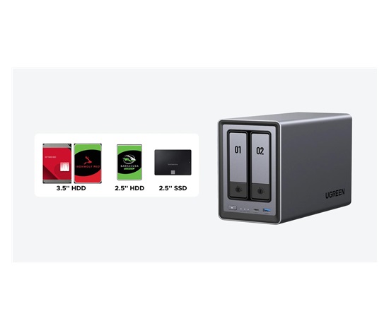 UGREEN NAS je kompatibilní s extrémně širokou škálou úložných disků, včetně 3,5„/2,5“ SATA disků a M.2 SSD. Podporovány jsou všechny nejoblíbenější značky pevných disků a neexistuje žádné omezení na konkrétního výrobce.