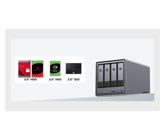 UGREEN NAS je kompatibilní s extrémně širokou škálou úložných disků, včetně 3,5„/2,5“ SATA disků a M.2 SSD. Podporovány jsou všechny nejoblíbenější značky pevných disků a neexistuje žádné omezení na konkrétního výrobce.