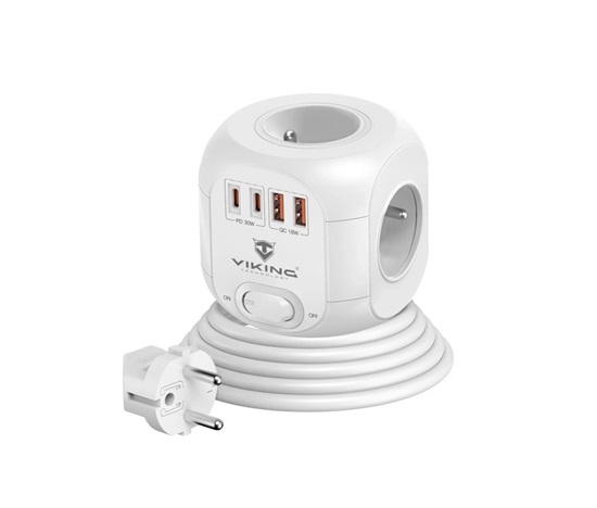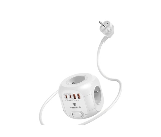 Viking AC CUBE PD30 kombinuje čtyři USB porty (2× USB-C, 2× USB-A), čtyři síťové zásuvky a 1,8m prodlužovací kabel v jednom elegantním a prostorově úsporném zařízení. Umožňuje současně napájet až osm spotřebičů nebo elektroniky, aniž by zbytečně zabíral místo na pracovním stole.