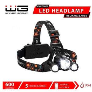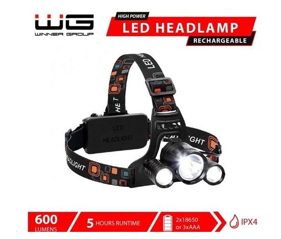 Vynikající, moderní a vysoce účinná čelovka od společnosti Winner Group bude skvělým společníkem při venkovních aktivitách. Je určena pro individuální použití ve tmě nebo v interiéru bez osvětlení. Čelovka vám skvěle poslouží při nejrůznějších dobrodružstvích jako je kempování, sportovní aktivity, noční rybolov, či prozkoumávání tajných chodeb a jeskyň. Kompaktní čelovku si můžete vzít prostě kamkoli, vejde se do batohu i kapsy. Čelovku si nasadíte na hlavu a rázem máte obě ruce volné a můžete je bez omezení používat. Díky možnosti nastavení předních světel směrem dolů až o 105° můžete upravit úhel světla podle vašich potřeb, aby světlo dopadalo přesně na požadované místo. Světlo má jas 600 lumenů a jeho dosah je 300 metrů. Výhodou této čelovky je, že si můžeme vybrat ze dvou variant napájení. Buď použijeme klasické tužkové baterie AAA, které po dosvícení vyměníme za nové, nebo můžeme použít baterie 18650, které po dosvícení dobijeme pomocí přloženého kabelu Micro USB.