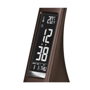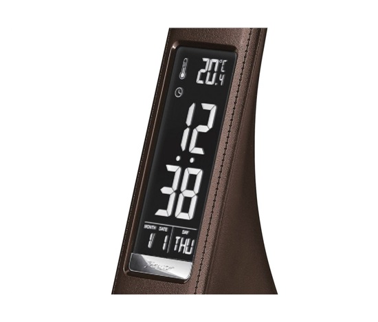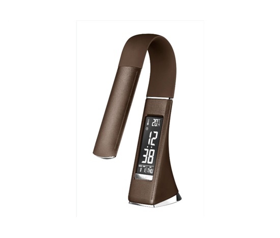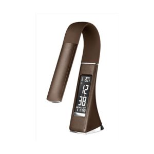 Kožená stolní LED lampa hnědé barvy s ohebným ramenem, které zajistí osvětlení požadovaného místa. Rovnoměrné a jemné světlo, které šetří oči. Nastavitelný jas ve třech úrovních. Citlivý dotykový panel pro snadné ovládání. Součástí lampy je displej s vysokým rozlišením, kterým zobrazuje hodiny, budík, kalendář, teplotu.