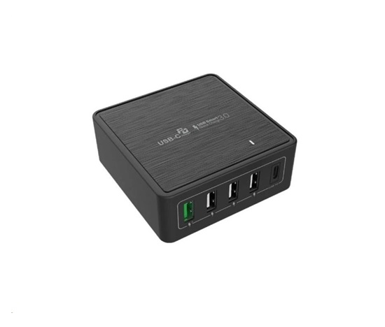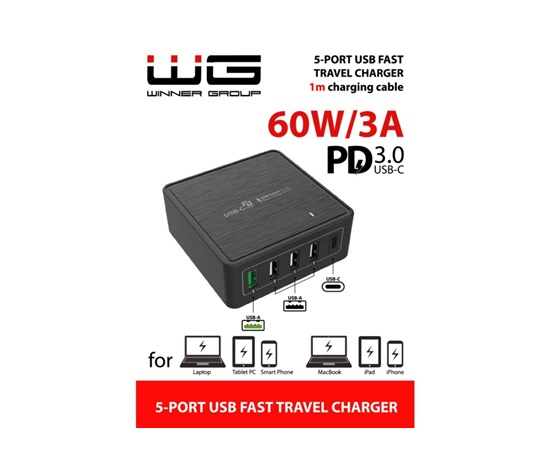 WG – Síťová nabíječka 5x USB 60W, 1x USB-A QC 3.0 + 3x USB-A Smart IC + 1x USB-C PD, černá
