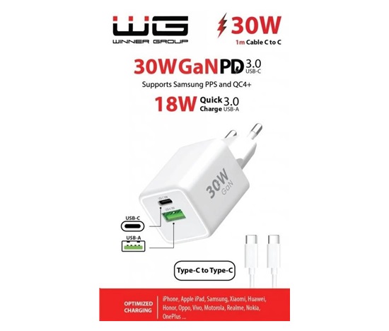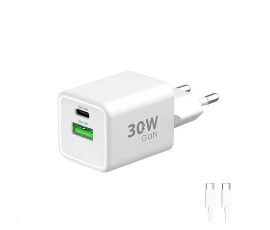 Síťová nabíječka GaN 30W je kompaktní, výkonná a odolná proti přehřívání. Díky duálnímu výstupu USB-C a USB-A nabízí široké možnosti využití pro smartphony, tablety i další elektroniku.