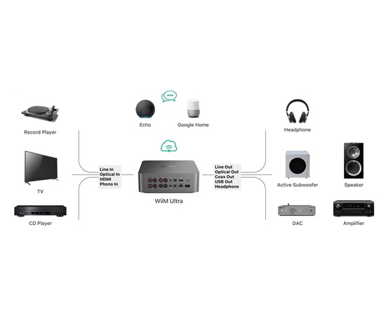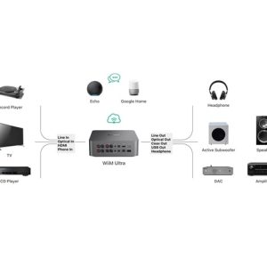 WiiM Ultra disponuje gramofonovým předzesilovačem, tím lze jednoduše připojit gramofon osazený MM/MC přenoskou. Předzesilovač Ultra pomůže nastavit akustickou korekci místnosti pomocí iOS telefonů a tím vylepšit výkon připojených reproduktorů a subwooferu. Subwooferový výstup umožní připojení subwooferu v kombinaci s integrovaným nebo koncovým zesilovačem bez subwoferového výstupu. Navíc díky vestavěnému EQ si lze upravit nízké frekvence dle vašich preferencí. Osazení HDMI ARC vstup umožňuje pohodlně připojit chytrou TV pro co nejjednodušší ovládání hlasitosti. Skrze HDMI lze do předzesilovače posílat Dolby Digital zvuk, díky kvalitnímu integrovanému D/A převodníku dosáhnete skvělého zvuku z TV.