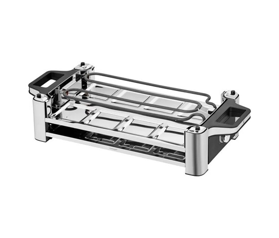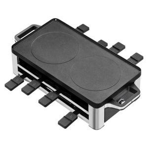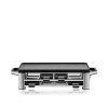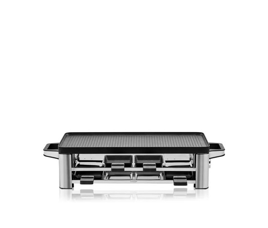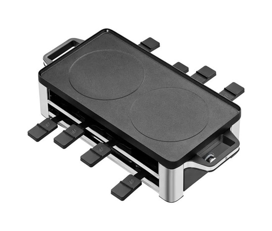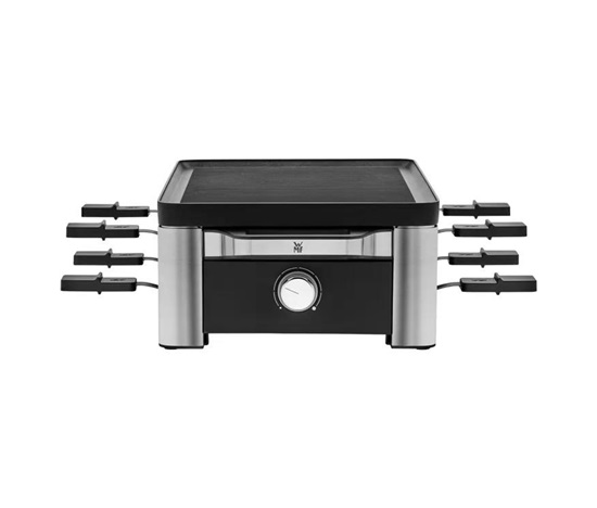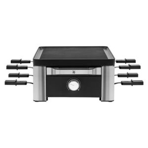 Raclette gril Lono od společnosti WMF je vybaven otočnou litou hliníkovou deskou s nepřilnavým povrchem, která je ideální pro jemné grilování i přípravu jemných palačinek. Jeho nastavitelná teplota se přizpůsobí každé chuti – od vydatných pokrmů z taveného sýra až po sladké pochoutky, jako je grilované ovoce.