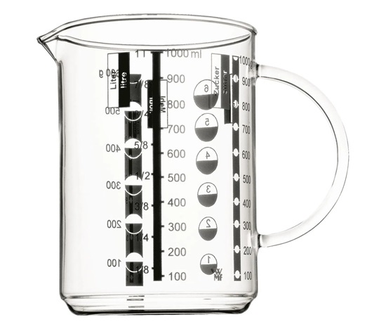 • Přesná stupnice: Přehledné značení v litrech a mililitrech zajišťuje snadné a rychlé dávkování surovin.