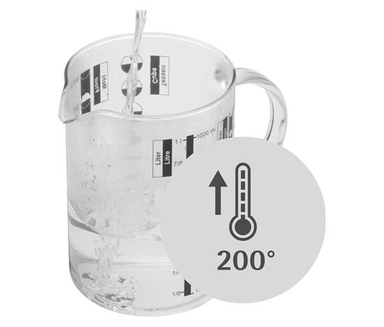 • Tepelně odolné sklo: Vyrobeno z vysoce kvalitního skla, které odolává vysokým teplotám, což umožňuje odměřování horkých tekutin přímo z hrnce.