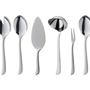 Obsah v balení 12x lžíce, 12x vidlička, 12x nůž, 12x lžička, 12x dezertní vidlička, 2x servírovací lžíce, 1x salátová vidlička, 1x servírovací vidlička, 1x naběračka, 1x lopatka na dort